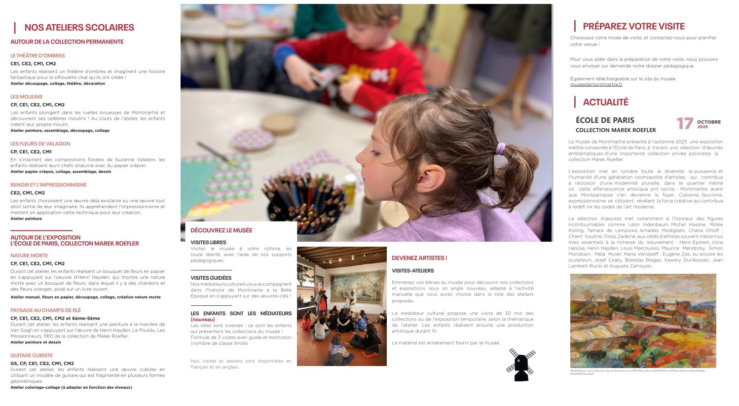 Faîtes découvrir l'Histoire de Montmartre autrement à vos élèves, en les faisant participer à une activité créative ! Nous vous proposons des thématiques en lien avec nos collections permanentes, comme Les Moulins de Montmartre, Le Théâtre d'ombres, les Fleurs de Valadon, Renoir et l'impressionnisme ou encore des ateliers en lien avec nos expositions temporaires.